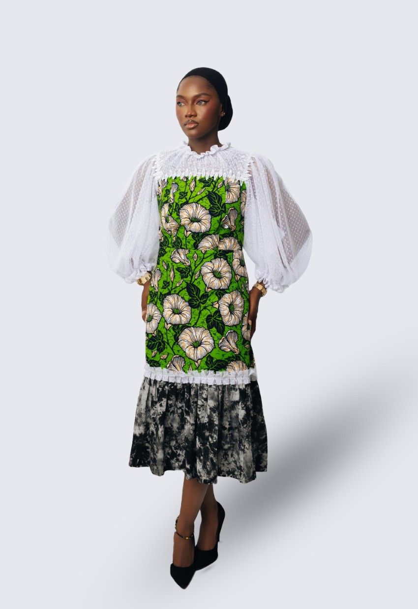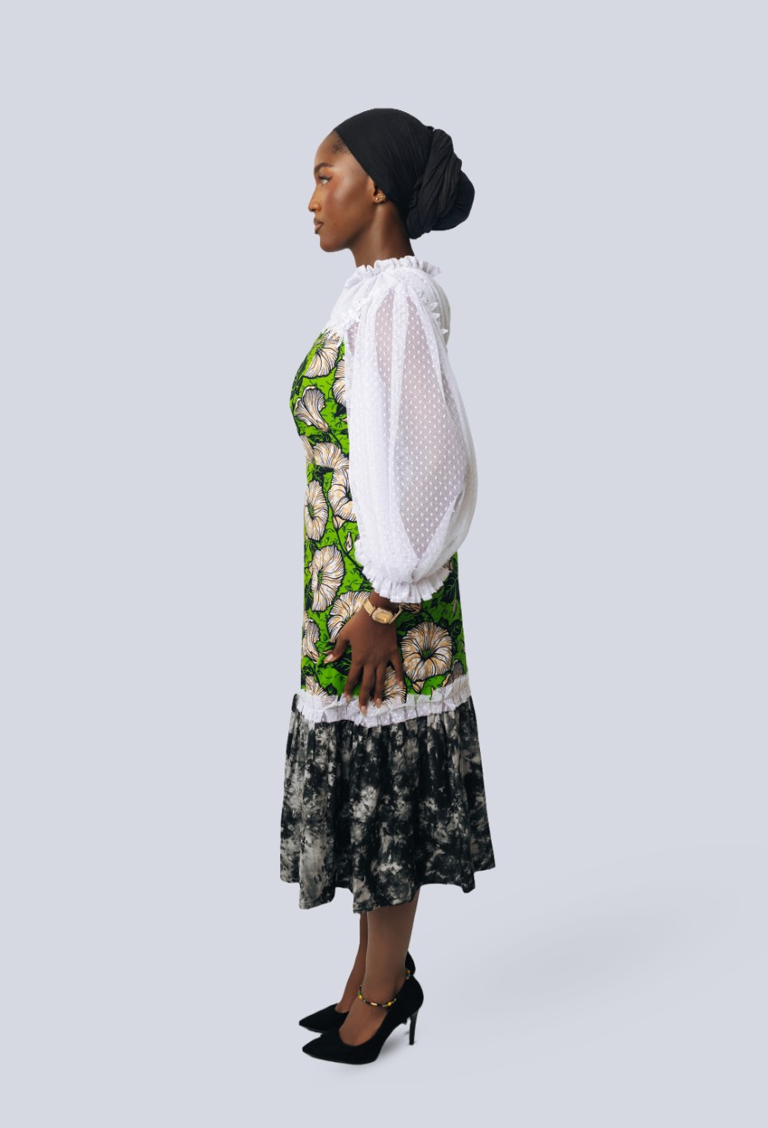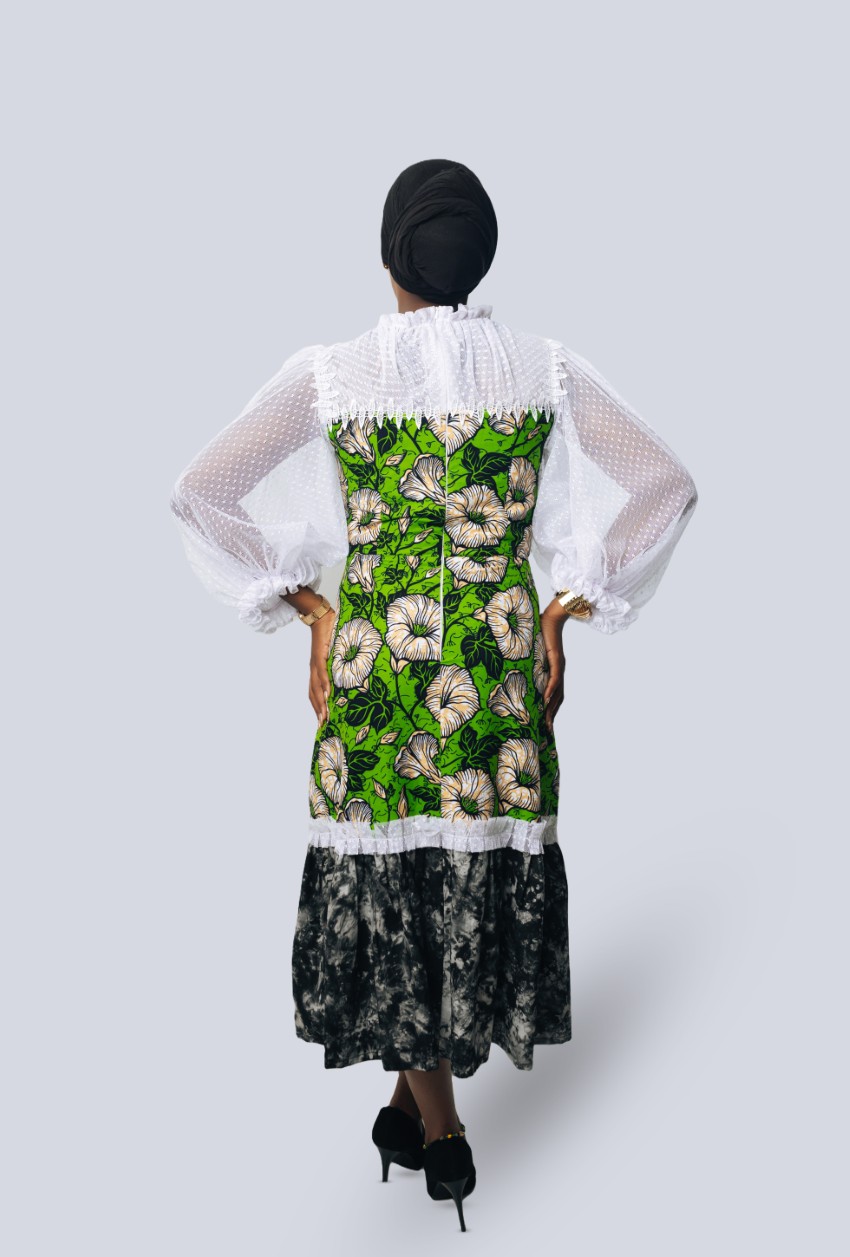 Made from vibrant African tie-dye fabric with lace accents on the chest and sleeves, combining structure with soft, airy detailing.
